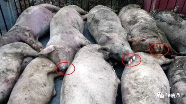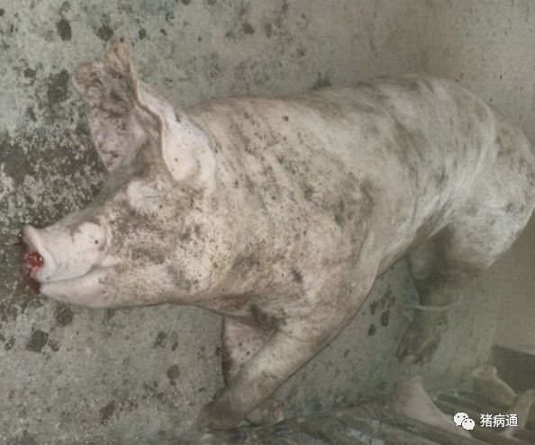 鉴别:猪急性链球菌(保育猪多发生)死亡后,虽然口鼻有血水但是比较稀薄,死亡猪只尤其是腹下皮肤呈刮痧样,有角弓反张情况。