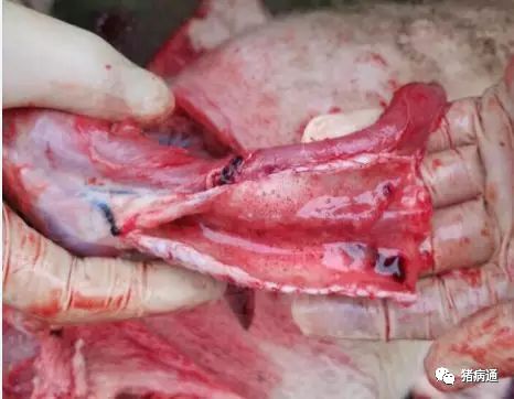 剖检病变:解剖后,在口鼻流出红色泡沫液体,气管、支气管充血,内有大量泡沫状液体。急性病例表现为耳、胸、腹下部和四肢内侧皮肤有一定数量的出血点,皮下组织广泛出血。全身淋巴结肿胀、出血。心包内积有淡黄色液体,心内膜出血,脾、肾肿大、出血。胃和小肠粘膜充血。关节腔和浆膜腔有纤维素性渗出物。